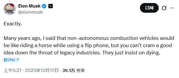 特斯拉官方这一比喻延续了马斯克12月17日的言论,他将非自动驾驶燃油车比作“骑马时用翻盖手机”,并断言传统车企“执意消亡”。这也是对福特等公司收缩电动化战略的回应。此前福特宣布将因成本取消多款电动车型,计提195亿美元的资产减值。
