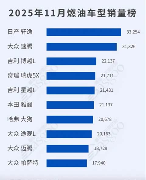 尽管当前国内新能源车的发展浪潮声势浩大,但从近期发布的11月销量数据来看,传统燃油车依然拥有强劲的生命力和基本盘。根据盖世汽车研究院的数据,当月燃油车销量前十的车型合计贡献了可观的份额,同时总体格局呈现出“日系稳坐头部、自主品牌强势崛起、德系阵营稳健布局”的特征,同时轿车与SUV两大品类平分秋色,接下来我们就来看看榜单前十的表现吧。