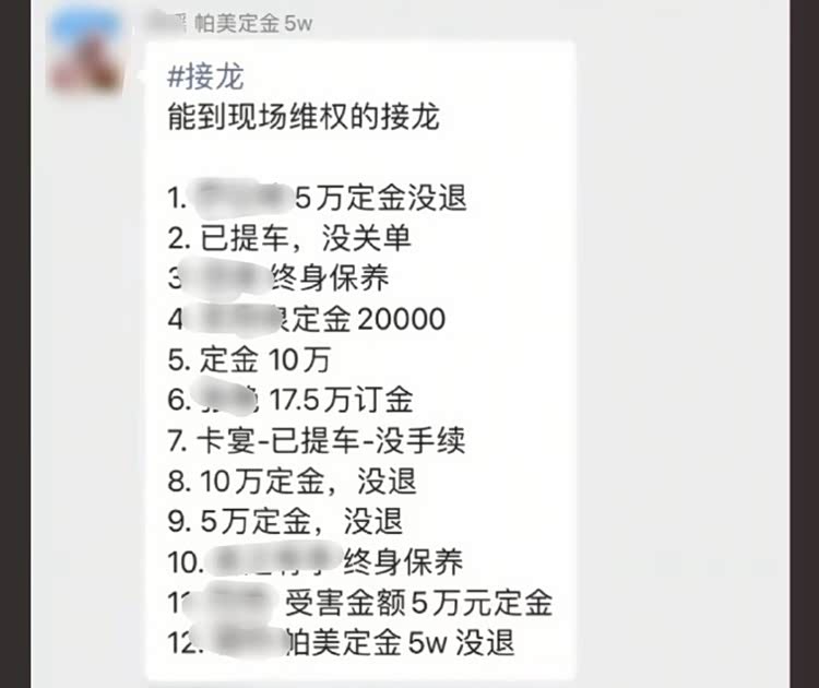 有网友曝光了聊天群的内容,多位消费者刚刚交了5-20万不等的定金,结果打了水漂。还有消费者刚提车,但车辆手续还没办妥,导致无法正常上牌。