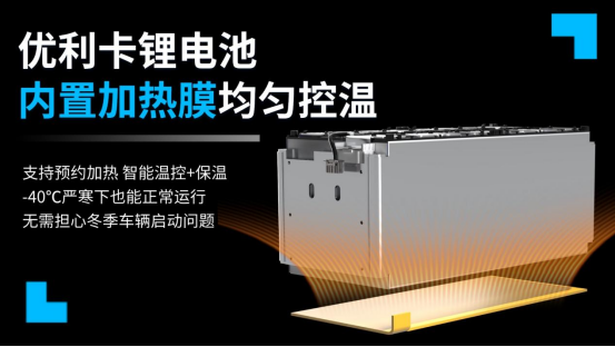 优利卡锂电搭载自主研发的低温加热系统,并非简单的被动保温,而是主动为电芯模组搭建恒温保护通道,确保每一颗电芯都处于适宜的工作温度区间。智能自适应加热功能,能够融合行驶习惯、环境温度和车辆实时数据,通过智能算法在行车后48小时内自适应加热,避免低温导致的性能衰减。