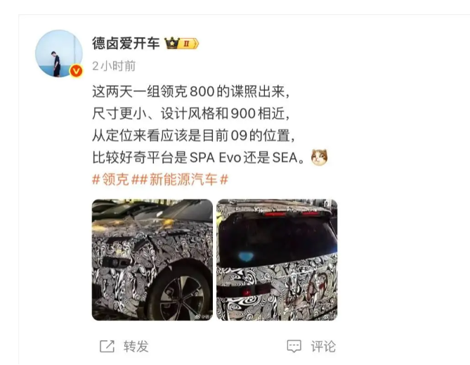 车家号·0浏览·2025-12-25 16:07 · 广东12 月 24 日消息,今天下午,博主 @德卤爱开车 晒出一组领克 800 的伪装车谍照。光从照片来看,新车的具体造型暂不得而知,仅仅局部展示了车头、车尾部分。