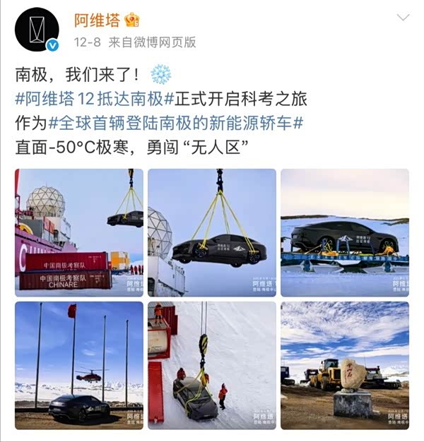 近日,阿维塔官方发布消息称,旗下车型 阿维塔12(参数|询价)已抵达南极中山站,完成-50℃极寒环境测试。