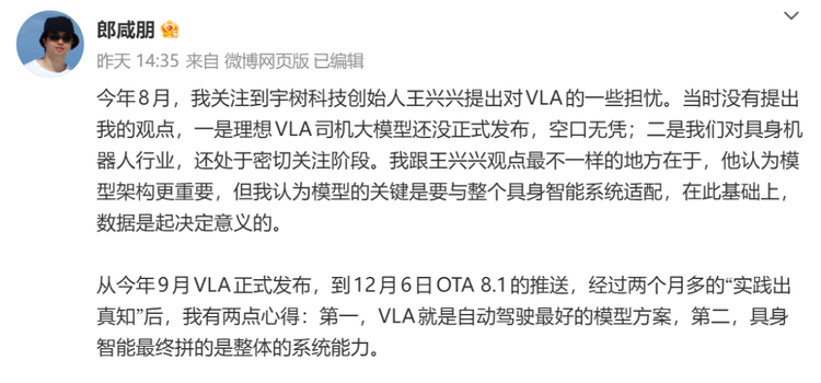王兴兴主张世界模型应作为核心决策架构,质疑VLA是“傻瓜式架构”。郎咸朋则反驳称,世界模型仅需作为“云端考场”,强调“看疗效”而非空谈架构。随后,小鹏汽车创始人何小鹏也发了一条长微博,力挺VLA。
