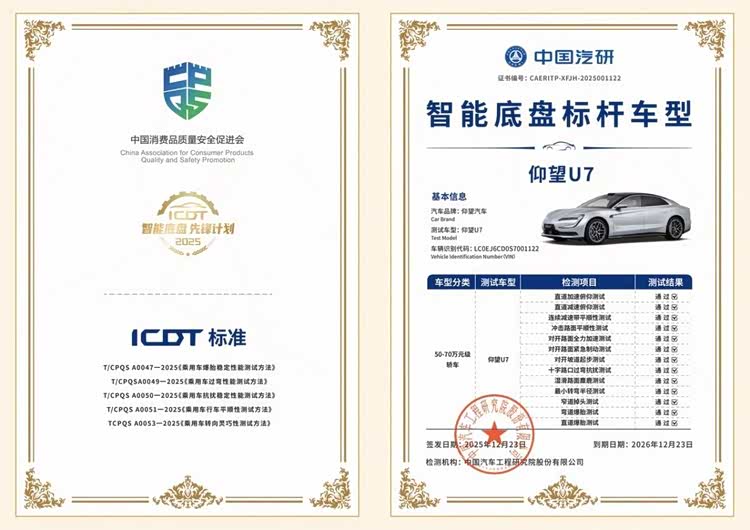 12月23日,由中国汽车工程研究院股份有限公司(中国汽研)发起的“2025智能底盘先锋计划”正式发布评测结果。仰望U7凭借领先的智能底盘技术与全面的实测表现,荣获最高荣誉“智能底盘标杆车型”,成为参评车型中唯一通过全部13项工况测试的车型,充分彰显其在安全性、舒适性与操控性方面的综合实力。