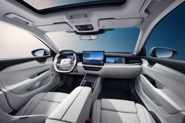 内饰方面,新车没有一刀切地去跟上新势力那种去实体按键化的设计风格,采用横向贯穿一体化设计,搭配分层包覆工艺,在视觉上营造开阔感,屏幕是全液晶仪表+悬浮式中控屏+副驾驶娱乐屏的组合,搭载了ID.OS 3.0智能交互系统,支持全场景语音交互和5G-V2X车路协同。