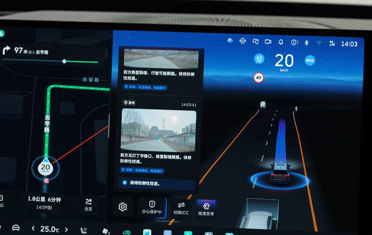 2. 提供思维卡片讲解。系统每做一个决定时,都会将当前行为的依据、判断路况的过程,用图文的形式显示在屏幕左侧,帮助驾驶者更快建立对VLA系统的信任。当然,把这个点单独拿出来说,是因为我认为它非常契合“人机共驾”理念——在它不断学习理解人类的同时,驾驶员也能够从这个思维卡片上看到“防御性驾驶”的实际演示。