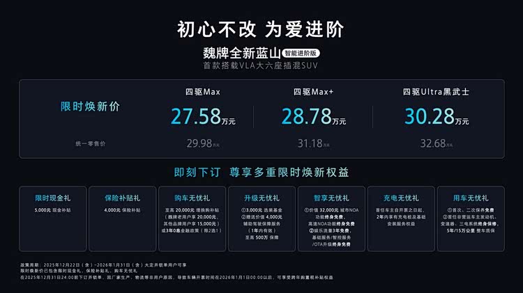 综合来看,全新蓝山智能进阶版凭借更贴合家庭需求的智能安全配置、更强劲高效的动力续航表现、更宽敞舒适的全舱空间,以及更具诚意的定价策略,展现出更全面的产品力。对于追求“全员舒适、全程安心、全周期经济”的家庭用户而言,全新蓝山智能进阶版无疑是30万级六座SUV市场的更优解。感兴趣的朋友可以到魏牌新能源零售中心预约试驾,相信这款车绝对会给您超出期待的体验!
