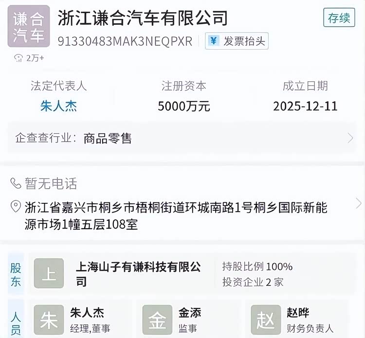 这家新公司注册资本5000万,法人朱人杰的来头可比想象中还大。这位46岁的量产大神,不仅在特斯拉上海超级工厂把Model Y日产能干到2000台,40多秒就下线一台,还曾主导得州工厂Cybertruck的量产攻坚,更是一汽-大众出身,懂传统制造也懂智能工厂。现在他身兼山子高科副总裁和山子有谦CEO,而山子高科早已布局整车、零部件、半导体的全产业链,连邦奇动力、康强电子都是其旗下资产,这“接盘”实力可一点不弱。更有意思的是,谦合汽车的名字藏着玄机:“谦”来自山子的“山子有谦”造车平台,“合”直接指向哪吒的母公司合众新能源,明摆着就是冲着盘活哪吒来的。
