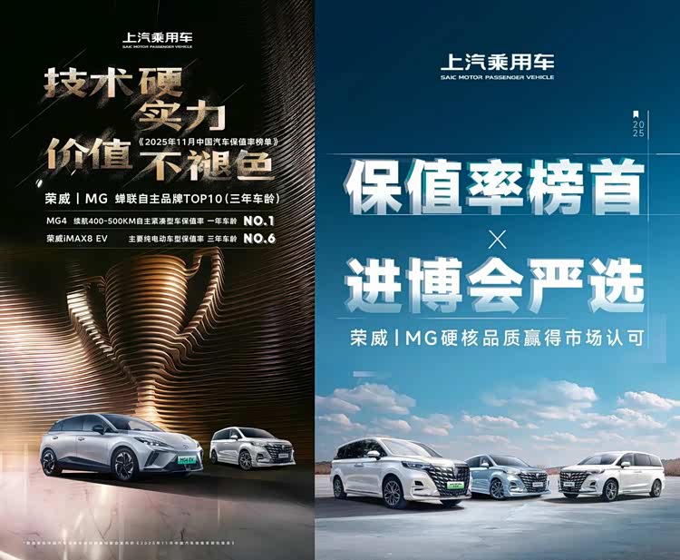 最终,所有努力汇聚为市场的直接认可。11月,上汽乘用车旗下荣威、MG品牌国内零售稳扎稳打,热销超8万辆,同比增长超10%;其中新能源零售销量同比劲增超183%,环比增长超24%。更为可贵的是,其产品长期价值同样经受住了市场严格考验。中国汽车流通协会11月报告显示,上汽乘用车荣威、MG稳坐自主品牌保值率TOP10。其中,MG4 EV在细分市场保值率榜单中高居第一;荣威iMAX8则在主要纯电动车型三年保值率榜单中位列第六,且今年已创下连续11次登榜的“全勤纪录”。销量攀升与保值率的双重验证,清晰表明其全面To C战略已成功打通从产品研发、市场对接到长期价值兑现的完整闭环,为其持续向上突破构筑起坚实的护城河。