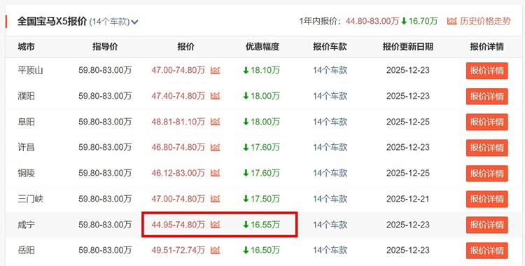 宝马X5自从国产了之后,其售价便下调了不少。而现如今,随着全新一代宝马X5马上问世,现款X5终端也已经 出现了很大的优惠幅度。据我们了解,目前宝马X5在全国的最低价格已经来到了44.95万起步,相当于终端直接降了16.55万元,那这性价比还是很高的。