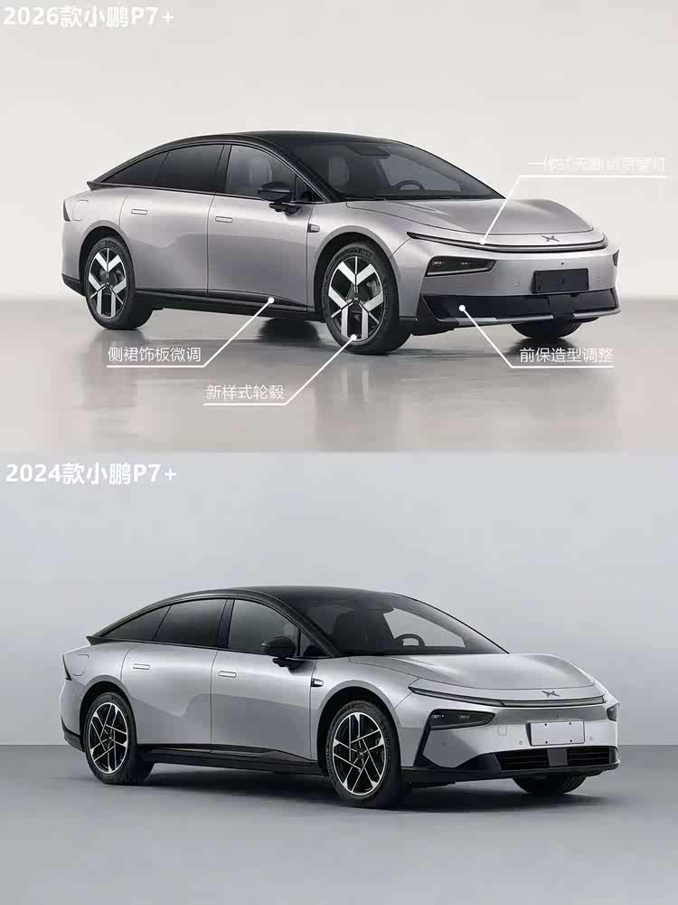 小鹏P7+是一款新能源中大型车,在售车型的指导价格区间为18.68万元-20.88万元,产品的续航里程和智能交互等方面比较抢眼,受到了许多年轻朋友的喜欢。目前,有网友拍到了新款(2026款)小鹏P7+实车现身街头,新车外观做了调整更新,将配备3颗图灵AI芯片,除了纯电版外,还会推出增程动力版本,有望2026年一季度完成上市,下面我们就先来一睹为快吧。