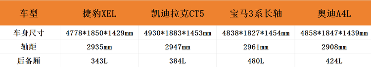 老规矩,先来看尺寸,捷豹XEL的长宽高分别是4778*1850*1429mm,横向对比来看,在一众豪华品牌B级车中,捷豹XEL不到4米8的的车长属于尺寸偏小的存在,2935mm的轴距则是介于奥迪A4L和凯迪拉克CT5之间。