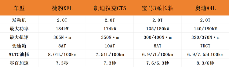 动力方面,捷豹XEL搭载了一台2.0T发动机,它没有高低功率之分,最大功率184kW,峰值扭矩365N·m,传动部分与之匹配的是8AT变速箱。只看参数,捷豹XEL的发动机最大功率超过了凯迪拉克CT5以及宝马3系和奥迪A4L的高功率版本,反映出了它厚道的一面。