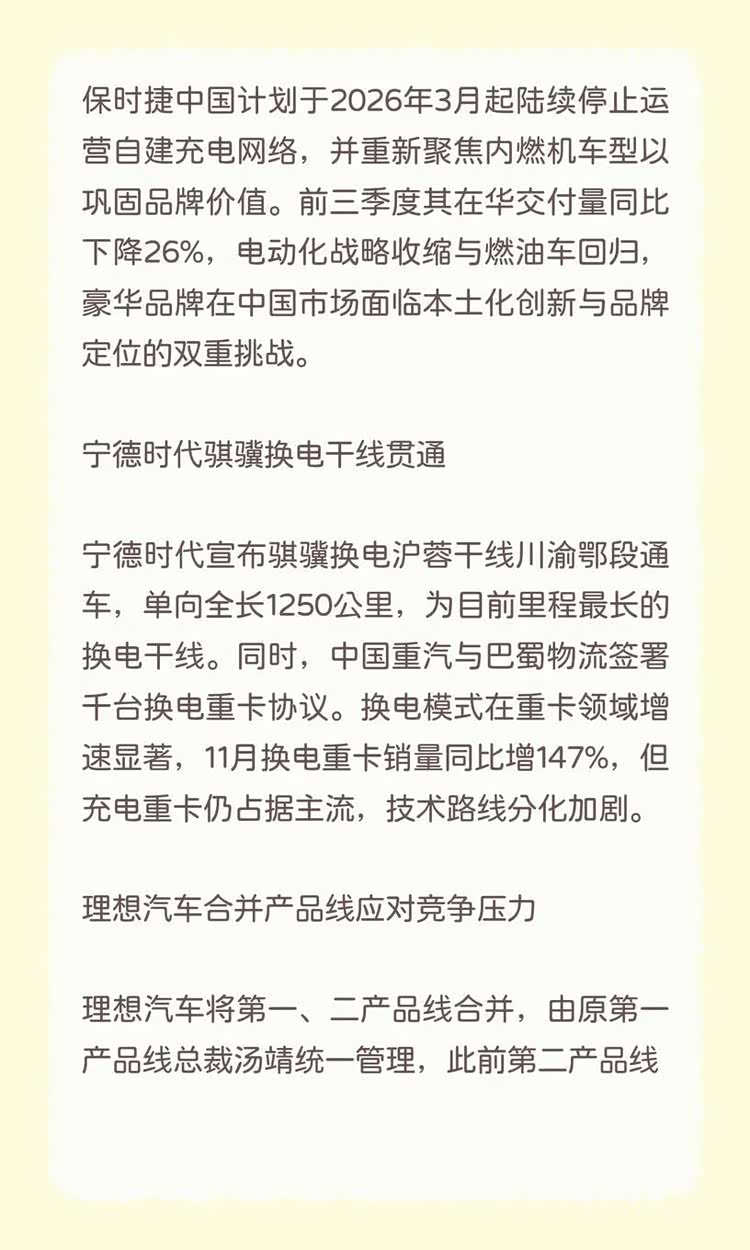 保时捷中国计划于2026年3月起陆续停止运营自建充电网络,并重新聚焦内燃机车型以巩固品牌价值。前三季度其在华交付量同比下降26%,电动化战略收缩与燃油车回归,豪华品牌在中国市场面临本土化创新与品牌定位的双重挑战。