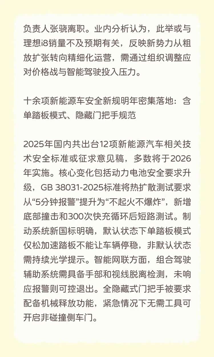 2025年国内共出台12项新能源汽车相关技术安全标准或征求意见稿,多数将于2026年实施。核心变化包括动力电池安全要求升级,GB 38031-2025标准将热扩散测试要求从“5分钟报警”提升为“不起火不爆炸”,新增底部撞击和300次快充循环后短路测试。制动系统新国标明确,默认状态下单踏板模式仅松加速踏板不能让车辆停稳,非默认状态需持续光学提示。智能网联方面,组合驾驶辅助系统需具备手部和视线脱离检测,未响应报警则可控退出。全隐藏式门把手被要求配备机械释放功能,紧急情况下无需工具可开启非碰撞侧车门。