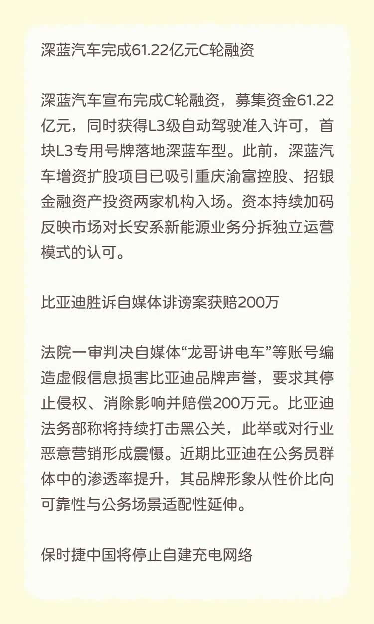 深蓝汽车宣布完成C轮融资,募集资金61.22亿元,同时获得L3级自动驾驶准入许可,首块L3专用号牌落地深蓝车型。此前,深蓝汽车增资扩股项目已吸引重庆渝富控股、招银金融资产投资两家机构入场。资本持续加码反映市场对长安系新能源业务分拆独立运营模式的认可。