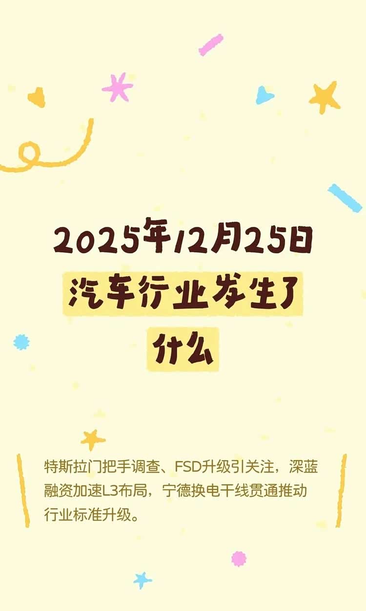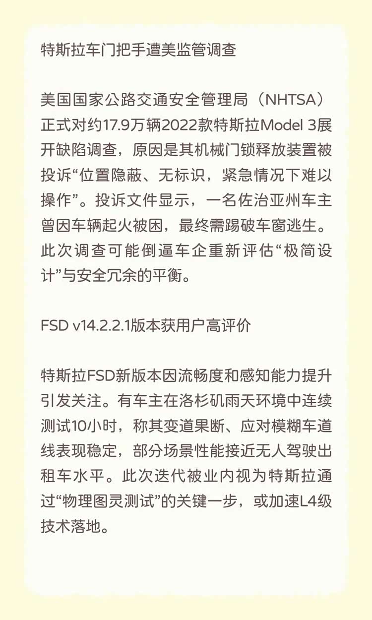特斯拉门把手调查、FSD升级引关注,深蓝融资加速L3布局,宁德换电干线贯通推动行业标准升级。