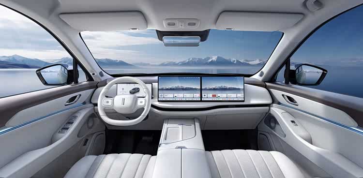 内饰整体的风格不变,较为吸睛的应该是中控屏与副驾驶屏是联屏,再加上12.3英寸的仪表,前排的观感足够清爽、科技。值得注意的是,新款魏牌蓝山全系标配了17.3英寸的后排屏幕,这是升级点。