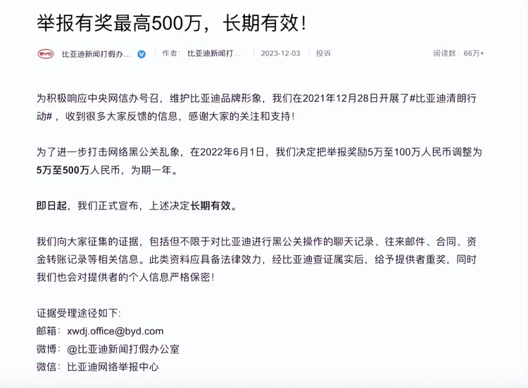 为打击恶意黑公关,比亚迪早在2021年便推出5万至100万元的悬赏机制,后将举报奖励提升至5万至500万元并长期有效。近年来,比亚迪针对多个恶意“黑号”发起诉讼并胜诉,既挽回自身损失,也对网络侵权行为形成有力震慑。