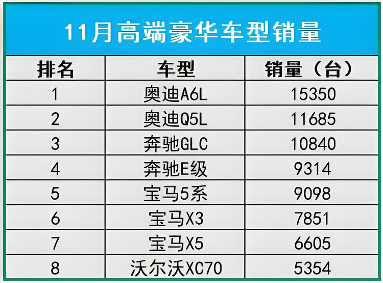 我在查看11月高端豪华车型销量的时候发现,消费者的选择和上面的说法大相径庭,最受欢迎的车型并非来自奔驰,而是奥迪,宝马反而居尾。