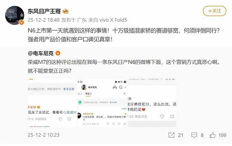 近日,东风日产N6正式上市,多位博主纷纷吐槽荣威M7在其微博下的“硬蹭”行为。从产品介绍到性能对比,荣威M7的评论无处不在,仿佛是一场精心策划的碰瓷营销。然而,这种低级的营销手段非但没有赢得消费者的好感,反而引发了广泛的批评和抵制。