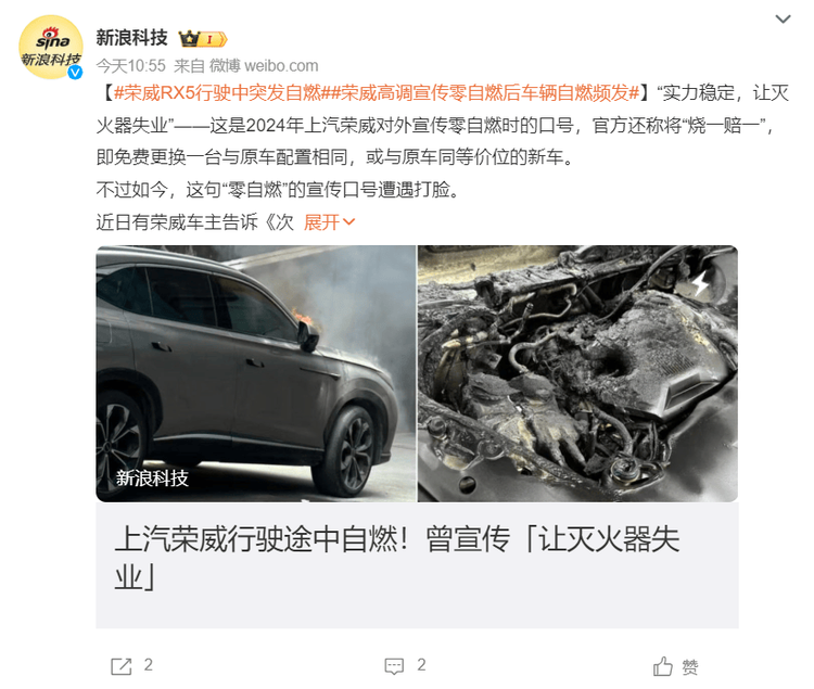 上汽荣威行驶途中起火自燃,昔日“让灭火器失业”宣传成笑谈