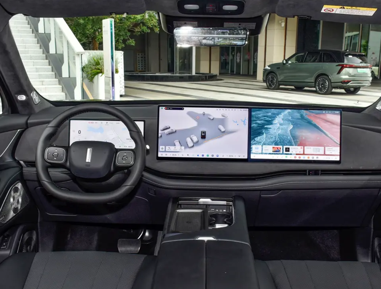 来到内饰,与上一代产品有着明显的不同,打开车门的感受就是用料升级更豪华,在车顶、中控台、车门都用绒毛材质软包,而且摸起来的质感很厚实,包括座椅也是形同的材质,但内饰没有加入饰板点缀,不过保留有镀铬套件装饰。并且升级许多电动化的配置,比如像无线充、电动后视镜带记忆功能、座椅带记忆、按摩通风和加热功能。简单的空调出风口和氛围灯的加入也让内饰更有层次感。液晶仪表升级到12.3英寸,配有29英寸的抬头显示,中控屏是15.6+15.6的尺寸,内置功能APP极为丰富,而且很多设置都集中在Coffee OS 3系统,比如座椅加热控制这些,当然也可以通过语音唤醒进行设置,而且车机升级到高通骁龙8295芯片,升级到5G模块,所以APP反应速度更快,更符合年轻人的操作习惯。