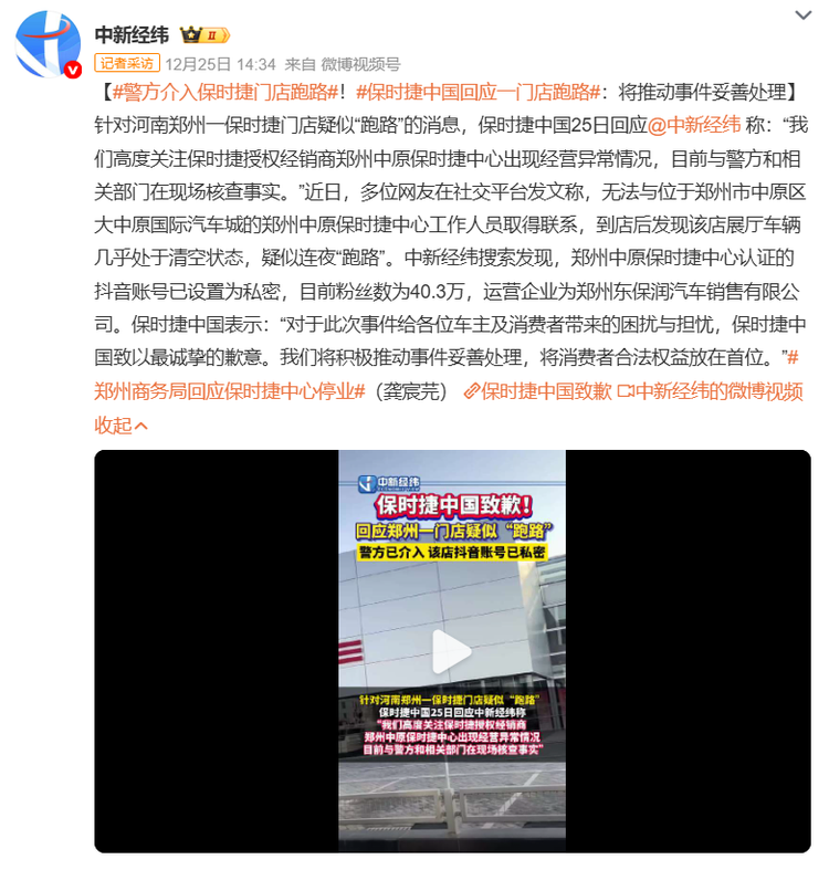 郑州保时捷4S疑似连夜“跑路”,保时捷中国迅速回应并致歉