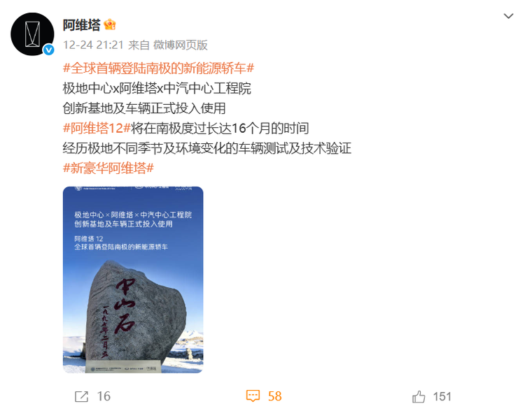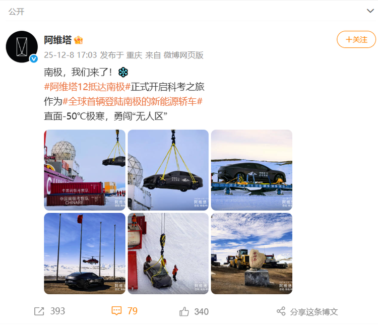 12月8日,阿维塔在官方微博上宣布,旗下车型 阿维塔12(参数|询价)作为“全球首辆登陆南极的新能源轿车”,已抵达南极中山站并开启科考之旅,将“直面-50℃极寒,勇闯‘无人区’”。