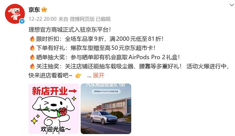 就在刚刚过去的12 月 22 日,东哥直接拿下理想汽车大单——理想汽车正式入驻京东,不仅开了官方旗舰店,还和京东汽车达成了独家合作。