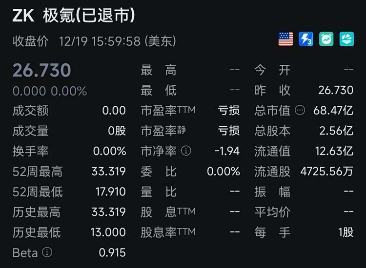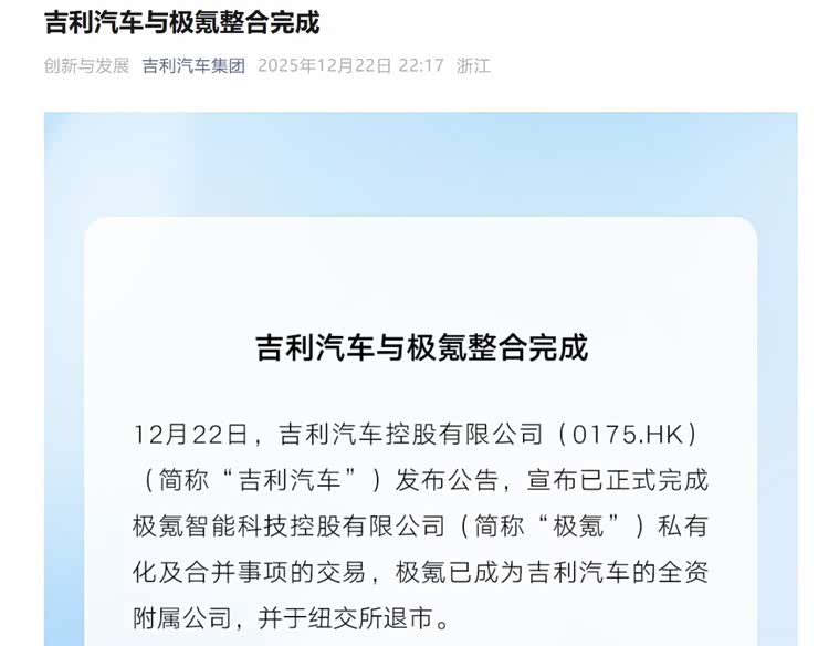 12月22日,吉利汽车(0175.HK)发布公告,宣布正式完成对极氪智能科技控股有限公司的私有化及合并,自此,极氪成为吉利汽车全资附属公司,并随即于纽交所退市。而在极氪退市前最后一个交易日,股价收于26.73美元/股,总市值481.28亿元。