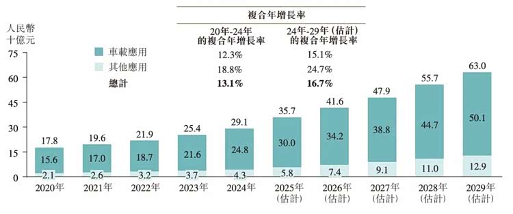 根据灼识咨询资料,毫米波雷达行业正处于快速增长阶段,全球毫米波雷达市场规模从2020年的178亿元增长至2024年的291亿元,复合年增长率达13.1%,预计市场将以16.7%的复合年增长率增长,2029年将达到630亿元。其中,车载应用占比显著高于其他领域。