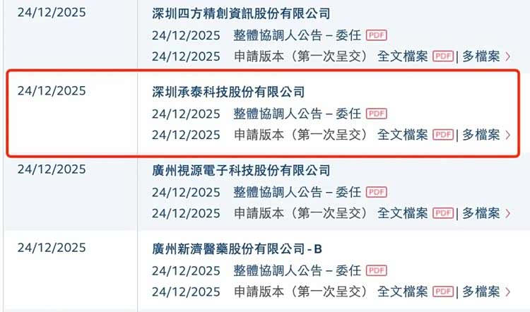 12月24日,港交所文件显示,深圳承泰科技股份有限公司(以下简称“承泰科技”)向港交所主板递交上市申请,国泰君安国际为独家保荐人。此前,其于今年6月提交的招股书因届满六个月已失效。