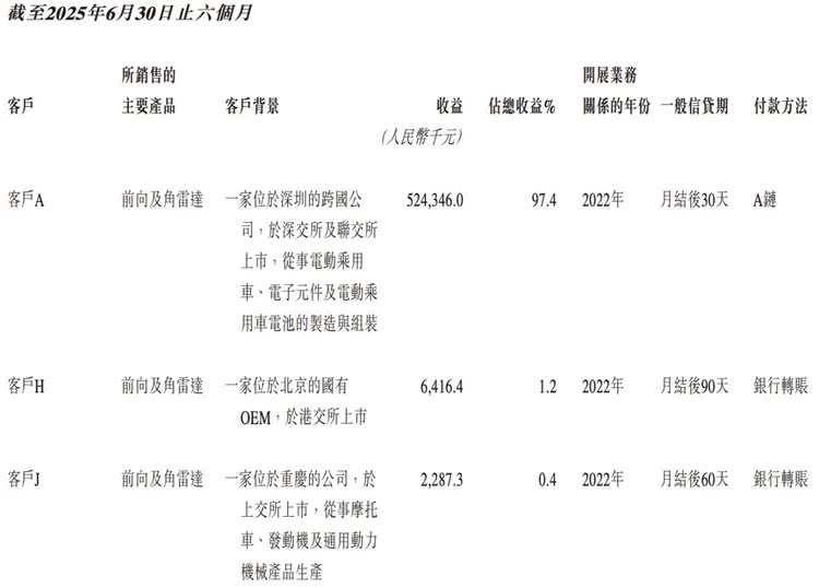 2022年至2024年,来自客户A的收益分别为4720万元、1.43亿元及3.26亿元,占公司总收益的81.9%、91.3%及93.6%。2025年上半年更是达到5.24亿元,占比97.4%,对比亚迪的依赖性越来越大。