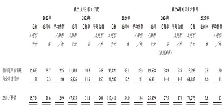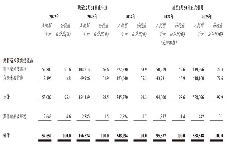承泰科技目前主要收益来自向OEM销售已商品化的毫米波雷达产品,其中前向毫米波雷达占比较大。但2025年上半年,这一情况发生了逆转,角毫米波雷达营收占比来到77.6%。