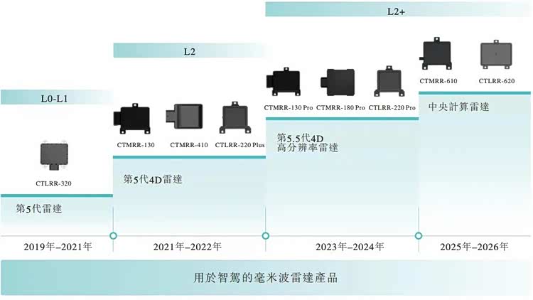 成立之初,承泰科技以77GHz毫米波前向波雷达CTLRR-100作为首项研发、制造产品,历经近十载,已打造出毫米波雷达产品矩阵,其中包括第5代4D雷达、第5.5代4D高解析度雷达、中央计算雷达等涵盖毫米波前向雷达、角雷达及其他类别的产品,涵盖由L0至L2+的智驾需求。