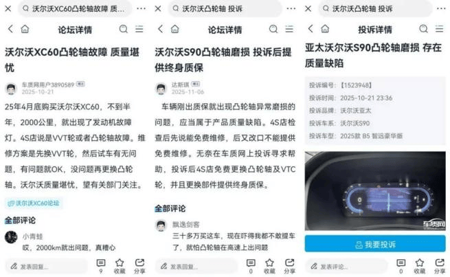 朱先生的遭遇并非个例。近期,沃尔沃汽车凸轮轴故障问题频繁出现,引发众多车主不满与维权。从各种汽车网站、车主论坛及社交媒体搜索“沃尔沃 凸轮轴”,相关帖子多达数百个。不少车主反映所在车友群约20%的车主遇到同类故障,多个维权群人数达数百人。
