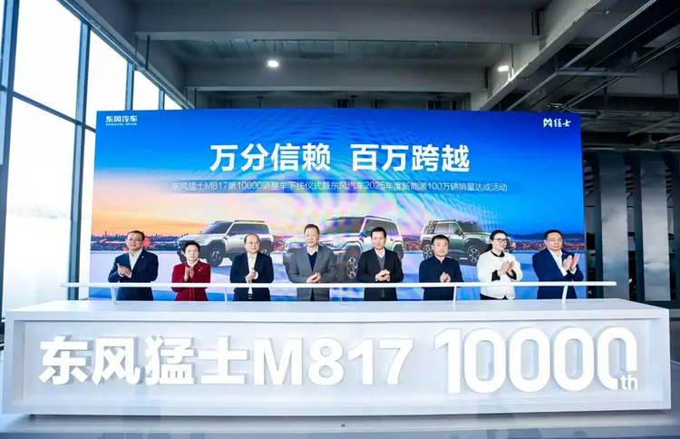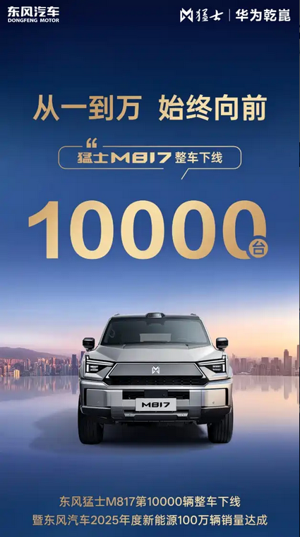 日前,猛士科技宣布, 猛士M817(参数|询价)迎来了第一万台整车下线,同时也是东风汽车旗下第100万台新能源车正式下线。这一里程碑的完成,标志着猛士M817在市场上的重要地位。值得注意的是,华为智能汽车解决方案BU CEO靳玉志成为了这款车的首位车主,进一步体现出华为与猛士科技在智能驾驶和新能源领域的深度合作。