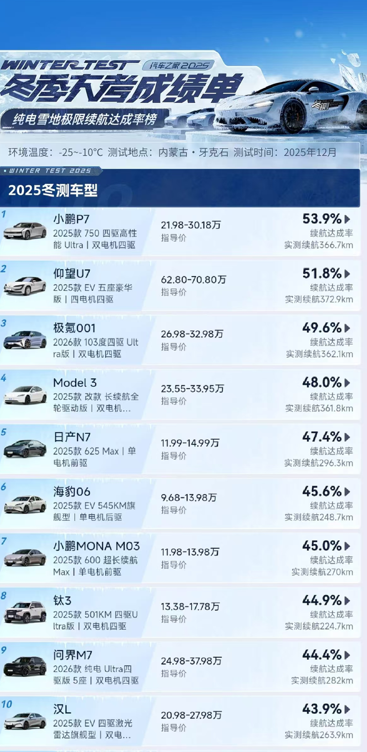 最终,小鹏P7(四驱)拿下冠军,达成率高达53.9%;仰望U7(四驱)排第二,达成率51.8%;新款 极氪001(参数|询价)(四驱)位列第三,达成率49.6%;Model 3四驱版达成率48%排在第四;日产N7(前驱)续航达成率47.4%,排在第五名,堪称黑马级存在。