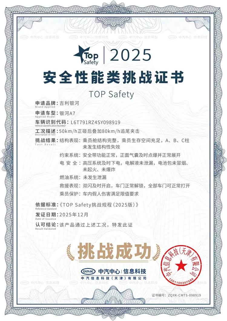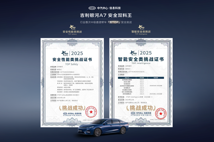 12月25日,中汽中心行业首次中型插混轿车“双TOP”顶级安全挑战结果出炉——吉利银河A7以行业唯一身份同时斩获安全性能类挑战证书与智能安全类挑战证书,正式坐实“十万级混动家轿安全新标杆”称号。作为吉利全球全域安全体系的技术结晶,这台新车用真实数据证明了什么叫做“安全家轿天花板”。
