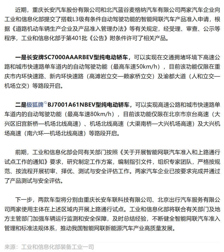 几天前工信部正式公布了我国首批L3级别有条件自动驾驶车型准入许可,一是长安牌SC7000AAARBEV型纯电动轿车,也就是长安 深蓝SL03(参数|询价)纯电版,二是极狐牌BJ7001A61NBEV型纯电动轿车,也就是极狐阿尔法S6。
