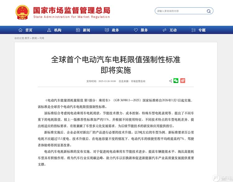 车家号·0浏览·2025-12-26 15:56 · 广东12月26日消息,据央视新闻报道,《电动汽车能量消耗量限值第1部分:乘用车》国家标准将于2026年1月1日正式实施,这是全球首个电动汽车电耗限值强制性标准,将推动新能源汽车产业向高效节能方向高质量发展。