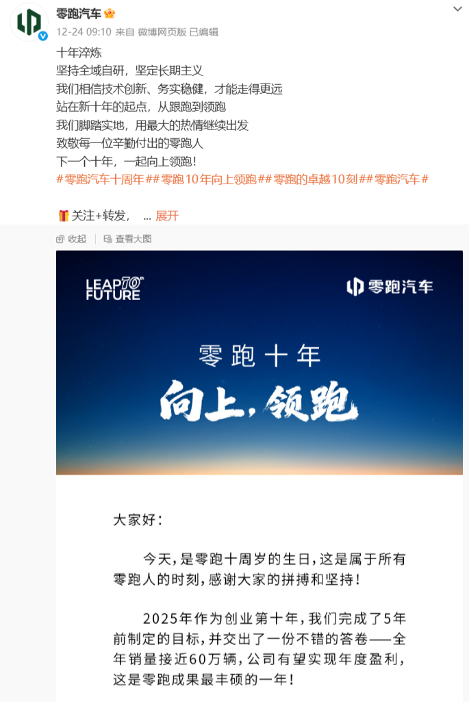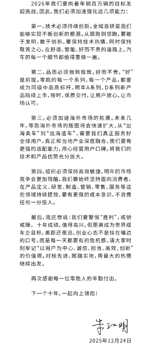 12月14日,零跑汽车创始人、董事长兼CEO朱江明发布《致全体零跑人的一封信》。信中有两个核心的内容,分别是明确宣布公司在2026年的销量目标为100万辆(2025年是50-60万辆),且为下一个十年定调,“不能再以‘新势力’自居,而要以一家可持续发展、值得尊敬的世界级车企来要求自己。”