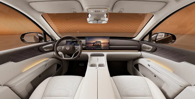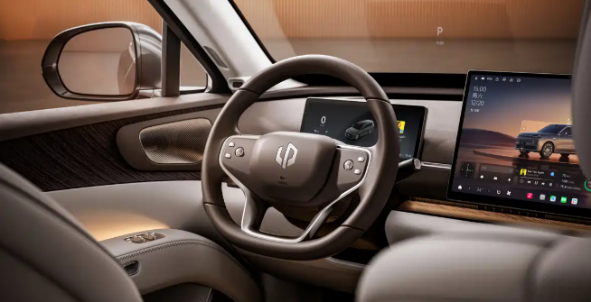 零跑D19内饰设计延续家族风格,同时向豪华级看齐。环抱式T字型座舱布局,双色拼接设计搭配木纹装饰件。17.3英寸大尺寸中控屏与10.25英寸液晶仪表构成视觉中心。