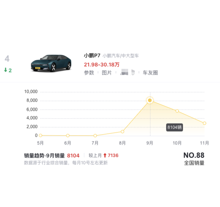 根据数据显示,全新小鹏P7的销量从2025年9月的8110辆骤降至10月的5662辆,而在11月整车销量仅2902辆,短短两月内跌幅超过六成。
