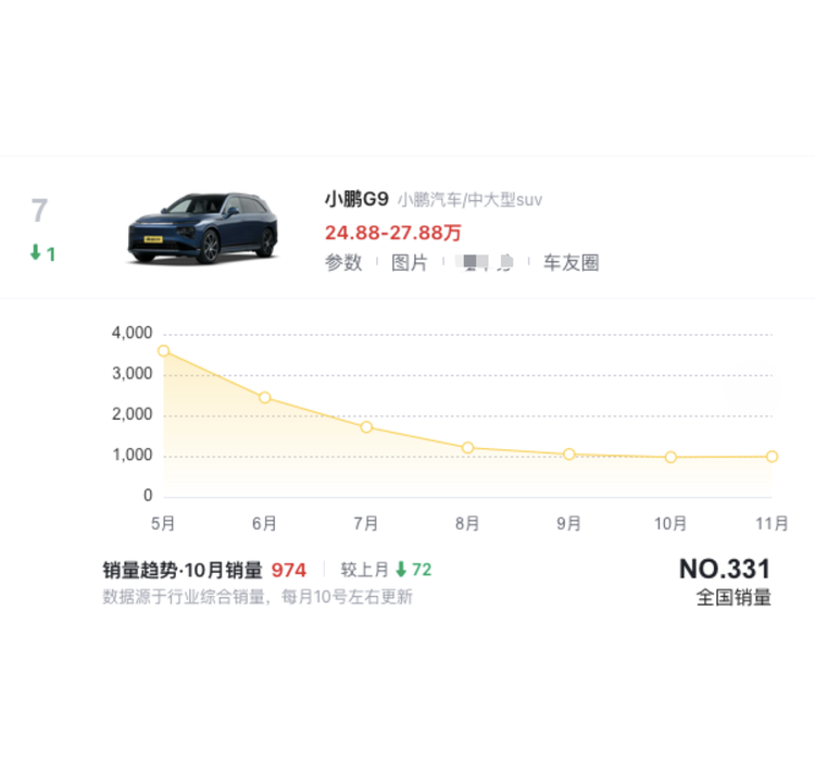 与小鹏P7一样陷入销量困境的还有小鹏G9,作为家族一款旗舰级的中大型纯电SUV,小鹏G9目前陷入了“平庸”的困境,整车自2022年上市之初就因复杂的配置和定价策略遭遇口碑危机,为其后续发展蒙上阴影。