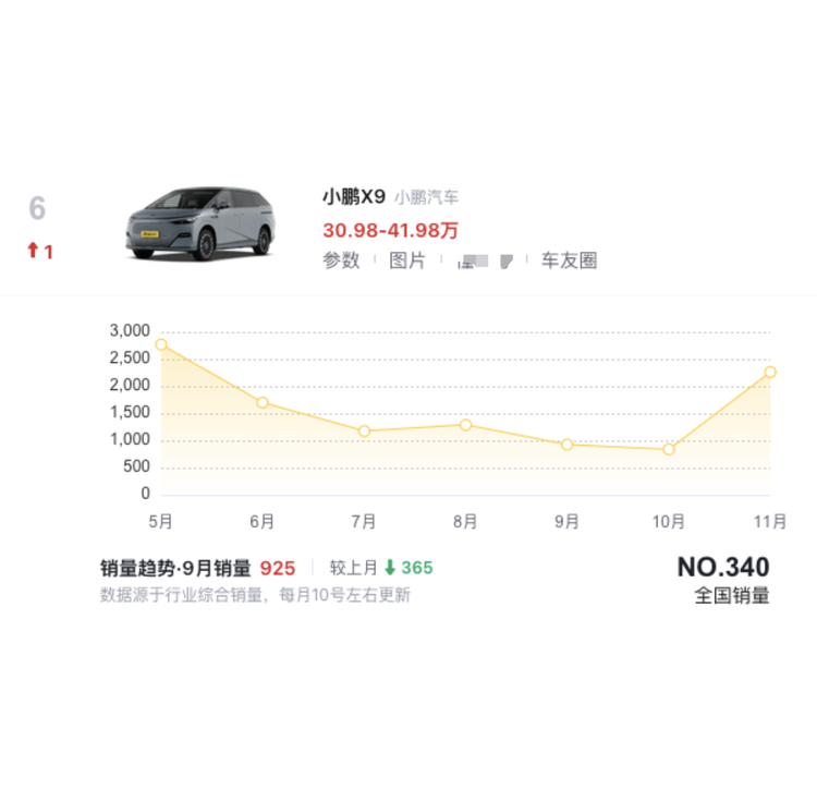 小鹏X9作为小鹏在MPV车型领域的重要车型,虽然在11月销量出现了明显反弹,但从5月份的高点持续下滑近半年,值得注意的是,虽然2025年5月小鹏X9的销量达到2767辆,但这一数字仅为同期混动MPV冠军腾势D9销量的约三分之一,同样未达到小鹏的预期。