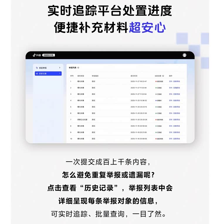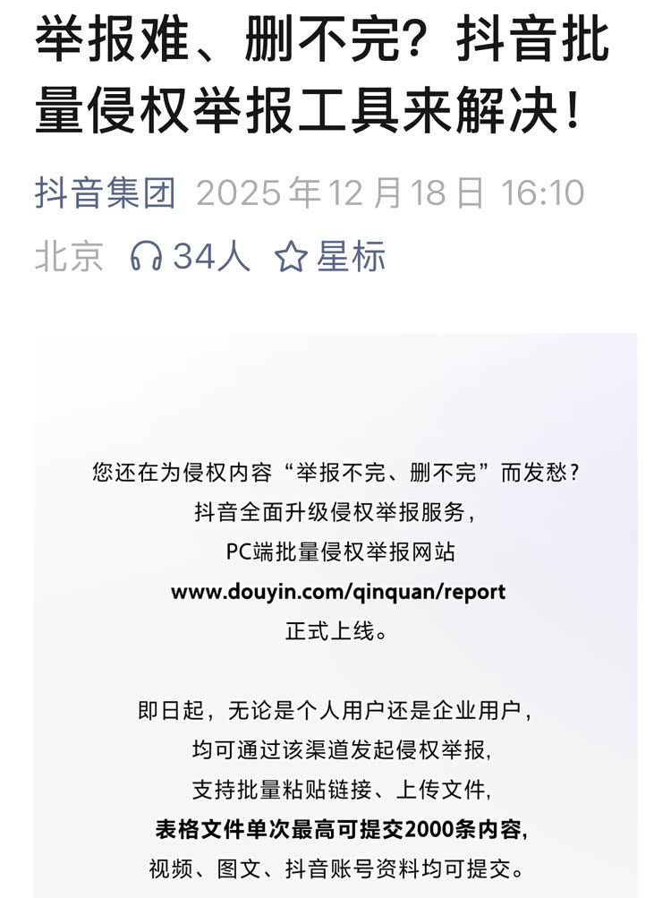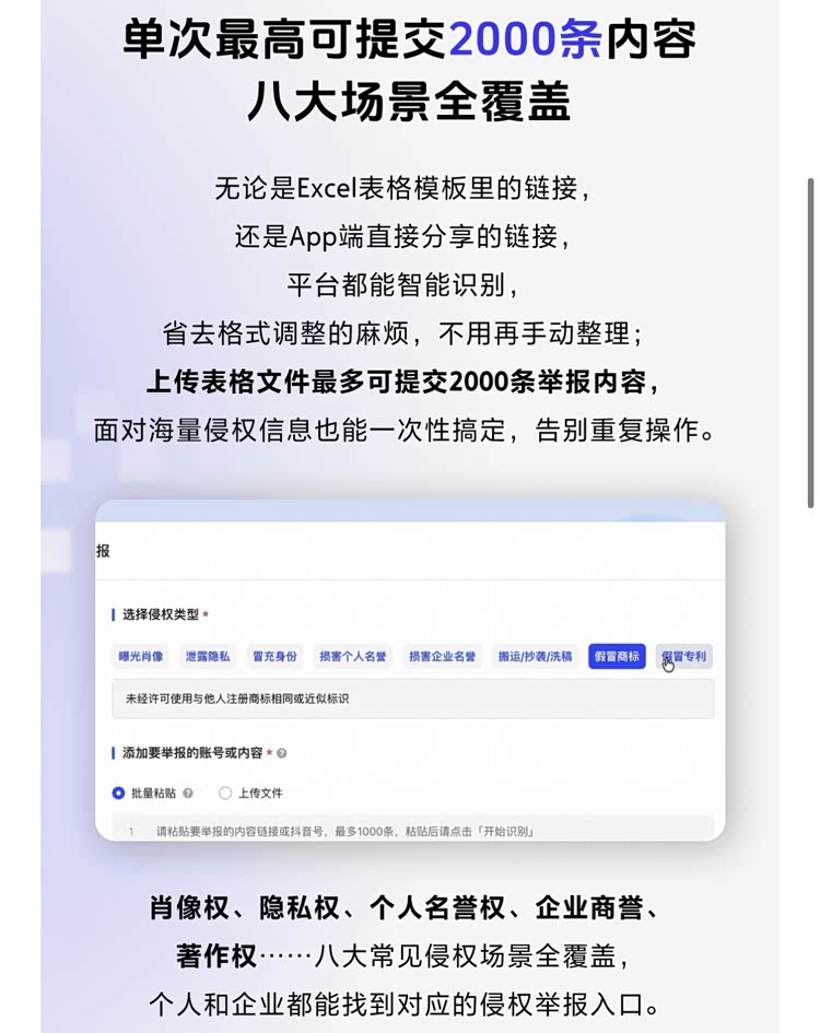 不要小看抖音这个动作的落地,这意味着此前企业遇到侵权行为“投诉无门”“处理效率低下”的情况将得到实质性的改变。此次“批量侵权举报”在添加侵权账号和内容的时候,最多支持一次性投诉多达2000条,处理效率、上传途径的便捷,也都体现出了对侵权行为严厉处置的态度。