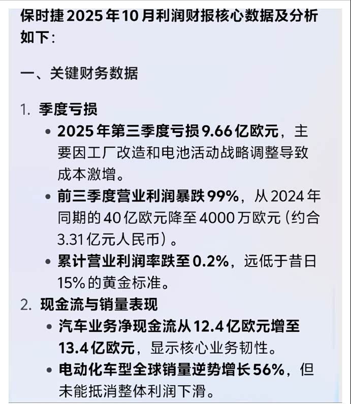 保时捷三季度财报显示,今年第三季度亏损达9.66亿欧元,约合人民币80亿元。前三季度,保时捷总营收为286.6亿欧元,同比下降6%;总营业利润仅4000万欧元,相较去年同期的40.35亿欧元同比下滑99%。