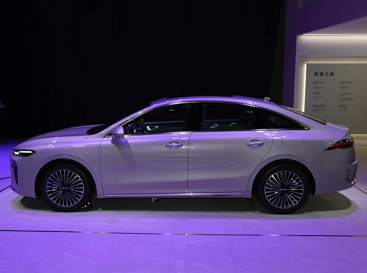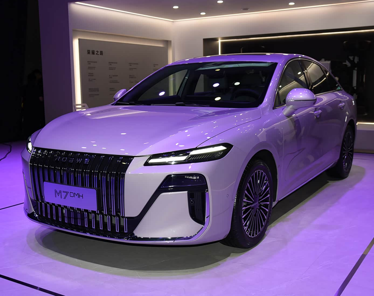 荣威M7在2025年9月17日上市,定位是中型插混轿车,限时售价8.58-10.28万元。这车最吸睛的地方在前脸,号称由劳斯莱斯前设计师约瑟夫·卡班操刀设计,配备有气场十足的直瀑式大嘴格栅,荣威字母车标集成在中网内部,配合上两侧分体式灯组,有着极强的视觉冲击力。